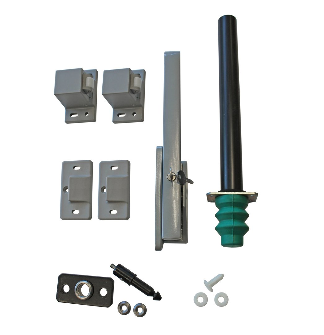 Incluye bloque de resorte y cerrojos x 2, liberación de seguridad interna (anula el bloqueo para que las personas no puedan quedar encerradas), manija frontal con cerrojo y llaves.