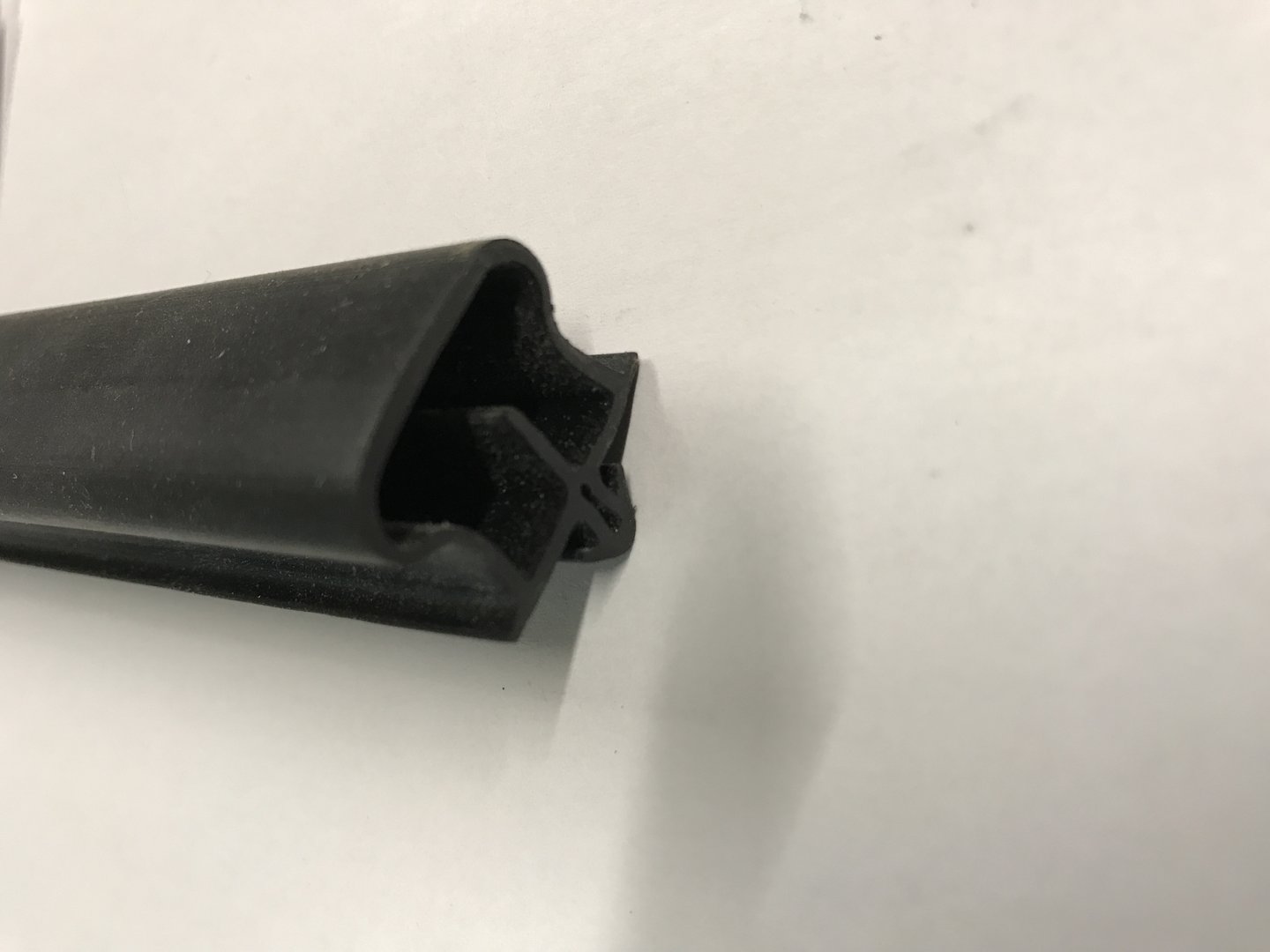Junta de puerta con bisagras comercial. Junta de compresión para puertas como la que se utiliza en las puertas fabricadas por Portiso. El producto es caucho EDPM negro y se vende por longitud. Número de pieza 01D011005